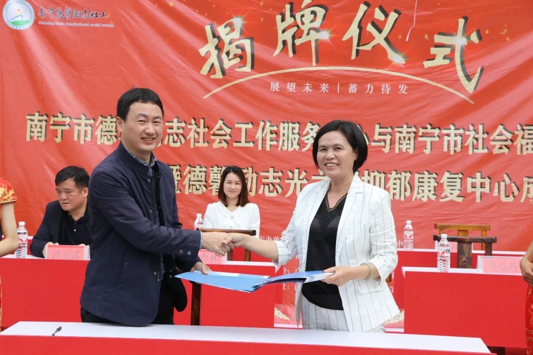 南宁市德馨励志社会工作服务中心理事长莫姿燕发表讲话:首先对前来参加此次活动的各位领导、嘉宾表示热烈的欢迎和衷心的感谢,德馨励志光之园抑郁康复中心依托于南宁市社会福利医院的强大的医疗团队,并结合德馨励志教育的特色,专门为有抑郁状态的未成年人提供一系列康复的课堂,我相信在与南宁市社会福利医院的合作下,能够充分的发挥双方的资源优势,康复中心的治疗效果和服务质量一定能够帮助更多有抑郁状态的孩子顺利康复,更好地融入家庭,回归社会,回归学校。