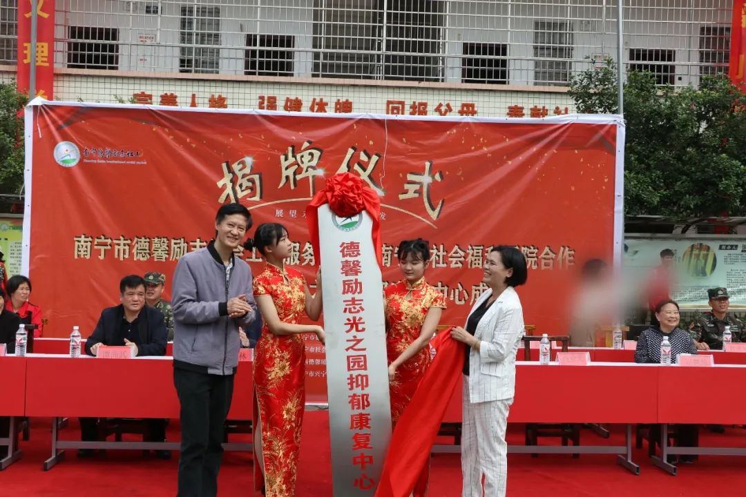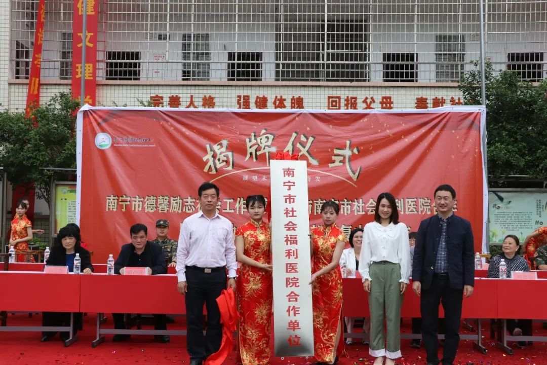 原南宁市政法委副书记谭尚武、南宁市社会福利医院副院长张春林,南宁市社会福利医院心身科护士长梁玉碧,南宁市社会福利医院、广西心理卫生协会秘书长伍业光教授,中国心理卫生协会大学生心理咨询专业委员会委员、广西心理卫生协会专家委员会委员刘惠珍,南宁市心理咨询协会会长刘玉萍,南宁市德馨励志社会工作服务中心理事长莫姿燕,广西德馨励志教育校长刘卫平,副校长梁燕妮,心理组主任彭丽蓉,总教官梁道雄,以及德馨励志教育全体师生参加了签约揭牌仪式。