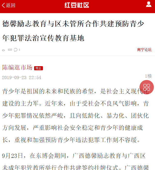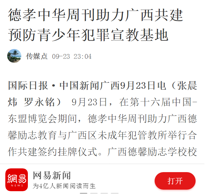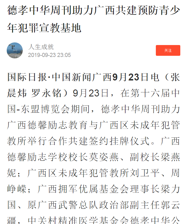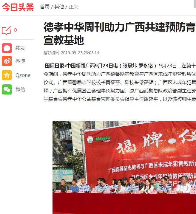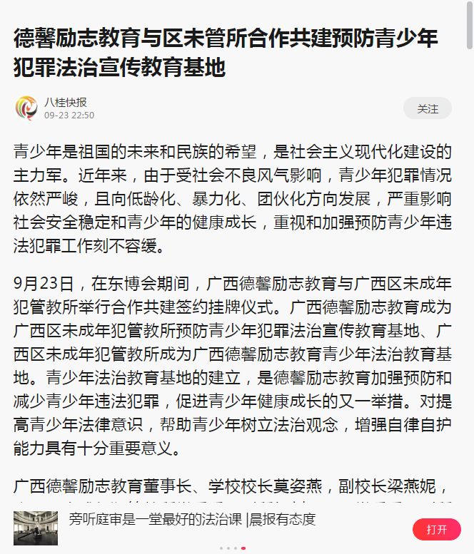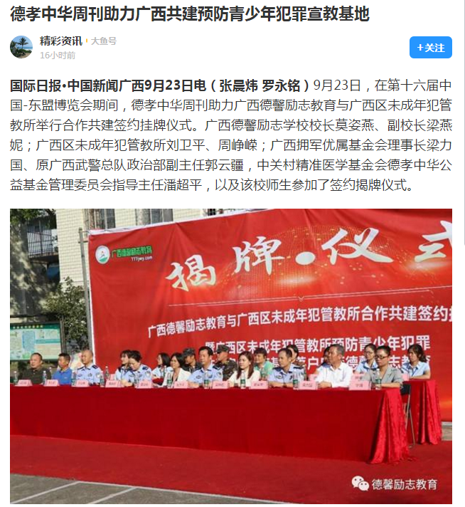 9月23日,在东盟博览会期间,广西德馨励志教育与广西区未成年犯管教所举行合作共建签约挂牌仪式。广西德馨励志教育成为广西区未成年犯管教所预防青少年犯罪法治宣传教育基地、广西区未成年犯管教所成为我校青少年法治教育基地。青少年法治教育基地的建立,是我校加强预防和减少青少年违法犯罪,促进青少年健康成长的又一举措。对提高青少年法律意识,帮助青少年树立法治观念,增强自律自护能力具有十分重要意义。