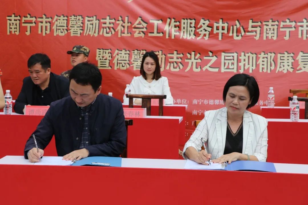 原南宁市政法委副书记谭尚武、南宁市社会福利医院副院长张春林,南宁市社会福利医院心身科护士长梁玉碧,南宁市社会福利医院、广西心理卫生协会秘书长伍业光教授,中国心理卫生协会大学生心理咨询专业委员会委员、广西心理卫生协会专家委员会委员刘惠珍,南宁市心理咨询协会会长刘玉萍,南宁市德馨励志社会工作服务中心理事长莫姿燕,广西德馨励志教育校长刘卫平,副校长梁燕妮,心理组主任彭丽蓉,总教官梁道雄,以及德馨励志教育全体师生参加了签约揭牌仪式。
